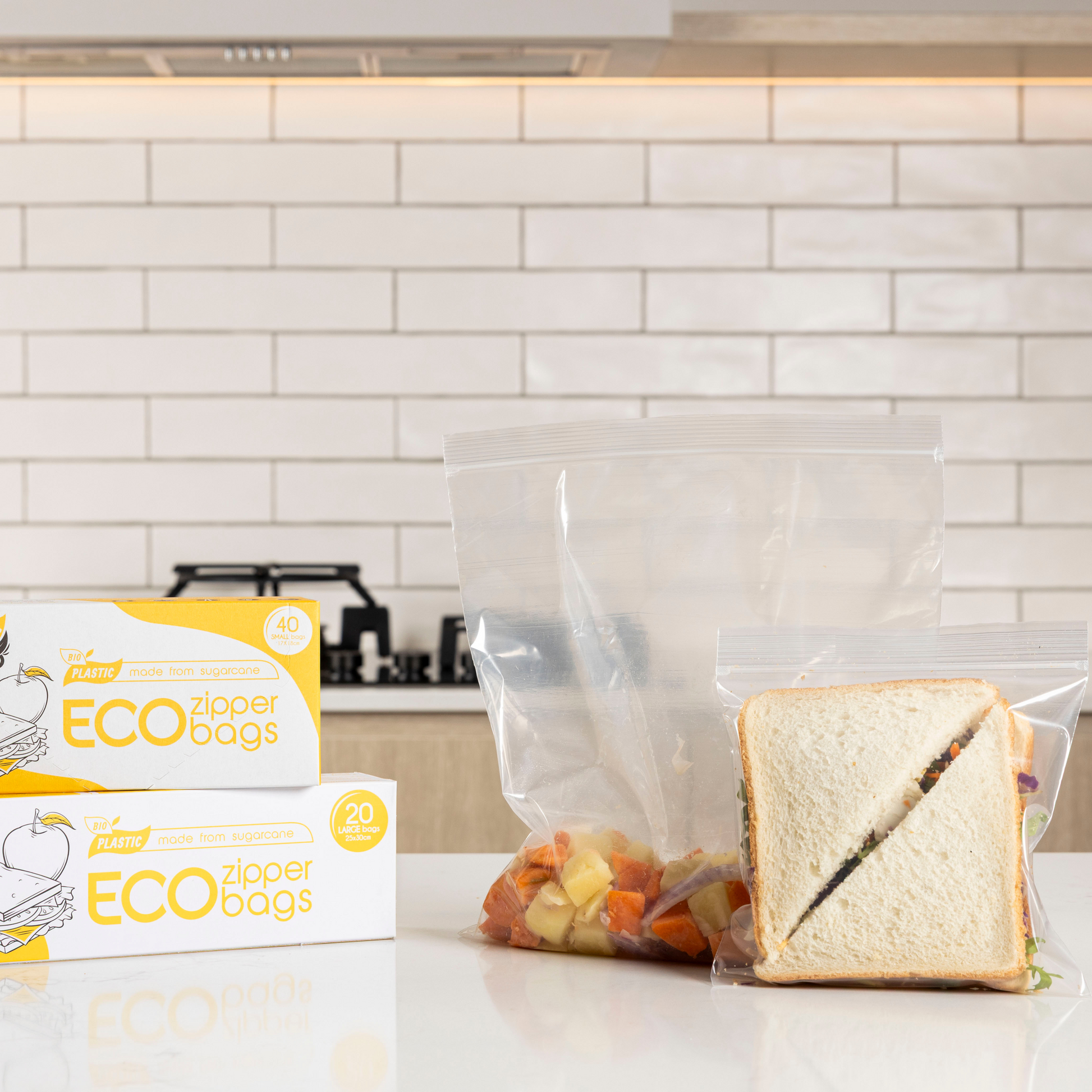 SugarWrap Eco Zipper Bags (Large Size) are a smart, sustainable solution for storing food—at home, on-the-go, or in the fridge or freezer. Made with 57% renewable sugarcane and USDA certified, these resealable ziplock sandwich bags keep food fresh, flavourful, and contamination free, while reducing your impact on the planet. The SugarWrap range offers the same functional durability as regular petro-based plastics, however, it is carbon positive and completely sustainable and renewable.